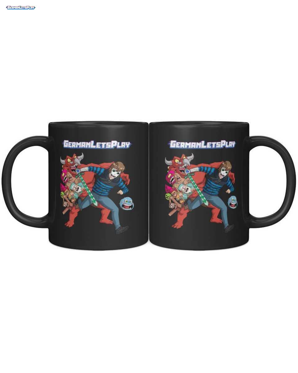 Das Design dieser Tasse katapultiert Fans direkt in das Herz eines GermanLetsPlay-Abenteuers: Der ikonische Maskierte Gamer kämpft Seite an Seite mit Puffi und Klumpi gegen einen Dämon, alles in einem dynamischen Comic-Stil. Es ist ein lebendiges Zeugnis der Fantasy-Welt des YouTubers und ein Must-Have für jeden, der Maskierter Gamer Fanartikel und GermanLetsPlay Merch liebt.