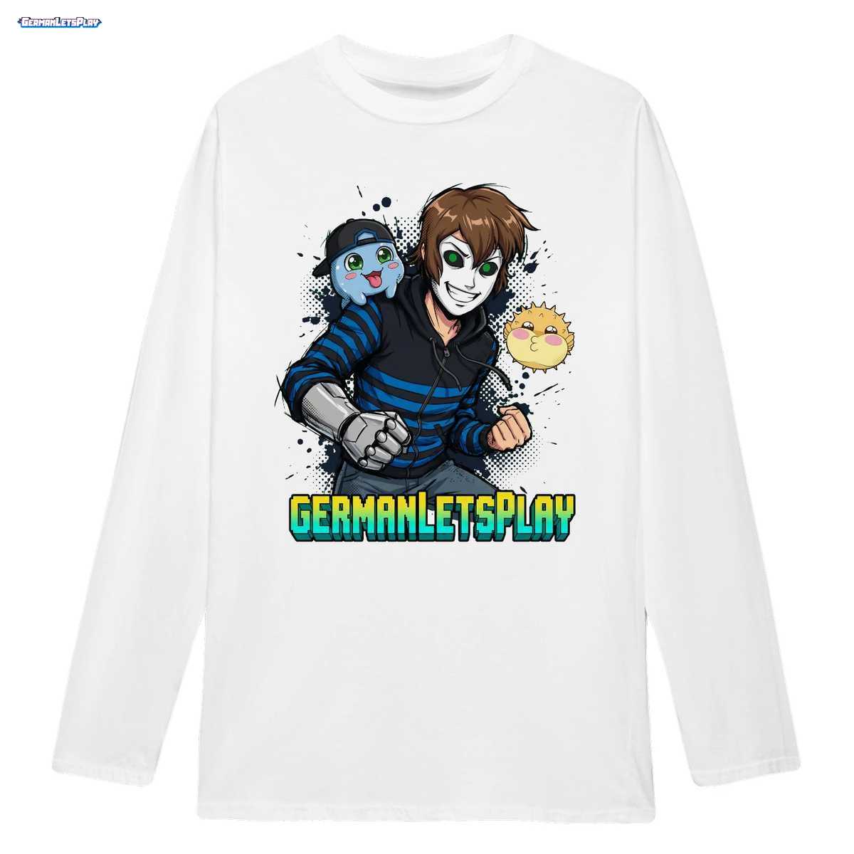 Dieses T-Shirt ist nicht einfach nur ein weiteres Stück Fanartikel. Es ist eine Hommage an unzählige Stunden voller Lachen, Spannung und epischer Gaming-Momente, die wir alle mit GermanLetsPlay geteilt haben. Das Design “Maskierter Gamer mit Schleim & Kugelfisch_1” wurde speziell für die Community entworfen, die die Details zu schätzen weiß. Die Illustration fängt die einzigartige Energie von Manu perfekt ein: Der maskierte Gamer, dargestellt in seinem ikonischen schwarz-blau gestreiften Hoodie, strahlt eine coole und konzentrierte Aura aus. Der metallische Handschuh verleiht ihm einen Hauch von futuristischer Stärke, ein Symbol für seine Gaming-Skills. Doch kein Abenteuer ist komplett ohne seine treuen Freunde. Auf seiner Schulter thront Klumpi, der süße blaue Schleim mit seiner charakteristischen Kappe, immer bereit für den nächsten Spaß. Neben ihm schwebt Puffi, der niedliche gelbe Kugelfisch, dessen Anwesenheit sofort ein Lächeln auf die Lippen zaubert. Diese Darstellung von Manu, Puffi und Klumpi ist mehr als nur ein Fanart; es ist eine Momentaufnahme der Freundschaft und des Zusammenhalts, die den Kern des Freedom Squads ausmachen. Der auffällige ‘GERMANLETSPLAY’-Schriftzug in leuchtendem Grün und Blau rundet das Design ab und macht unmissverständlich klar, für wen dein Herz schlägt. Wenn du dieses Shirt trägst, kaufst du nicht nur “Manu Merch”, du trägst ein Stück Community-Stolz.