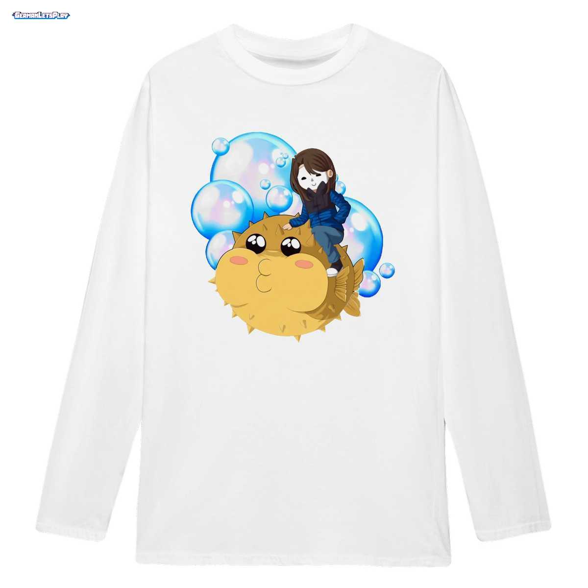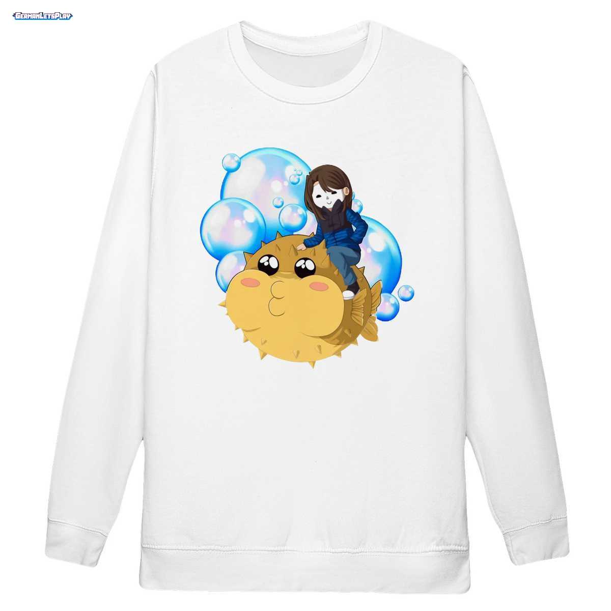 Das Herzstück dieses Shirts ist zweifellos das einzigartige Motiv. Es ist ein Stück Fankultur, das sofort ins Auge sticht. Im Mittelpunkt steht eine liebevoll gezeichnete Cartoon-Version von GermanLetsPlay, erkennbar an seinen braunen Haaren, der blauen Jacke und natürlich der ikonischen weißen Maske. Doch er ist nicht allein: Er sitzt fröhlich auf seinem treuen Begleiter, dem großen, gelben Kugelfisch Puffi. Dieses Manu und Puffi Fanartikel-Design erzählt eine Geschichte von Freundschaft und gemeinsamen Abenteuern.
